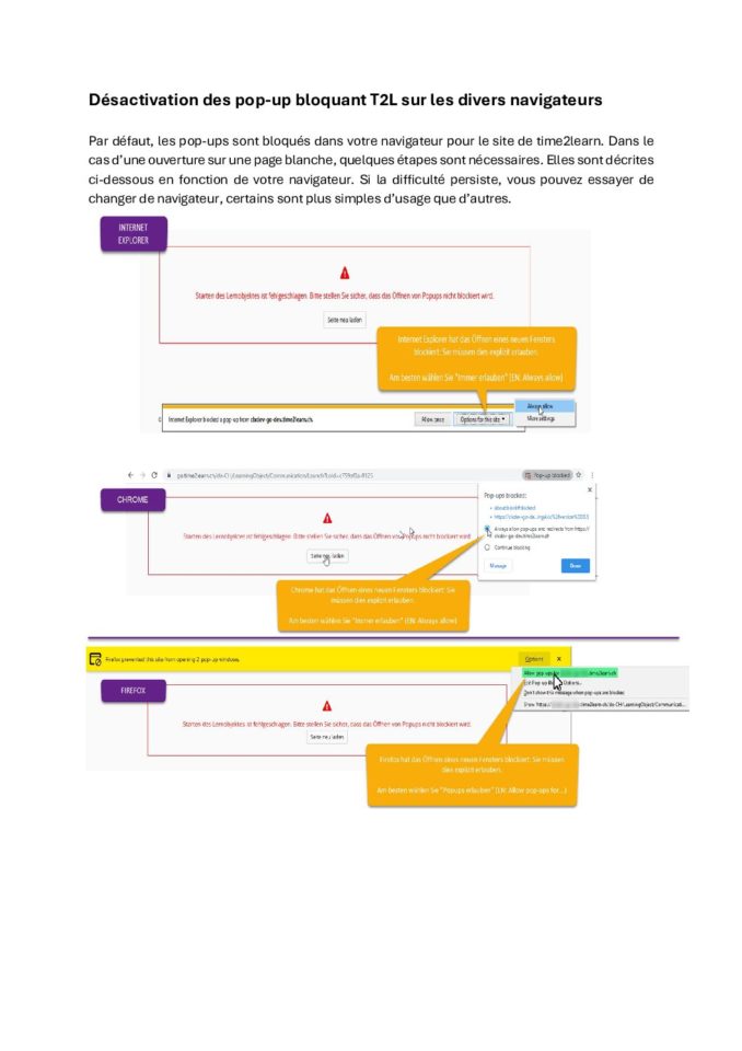 - Désactivez les pop-up de votre navigateur, pour que les différentes pages puissent s’ouvrir.